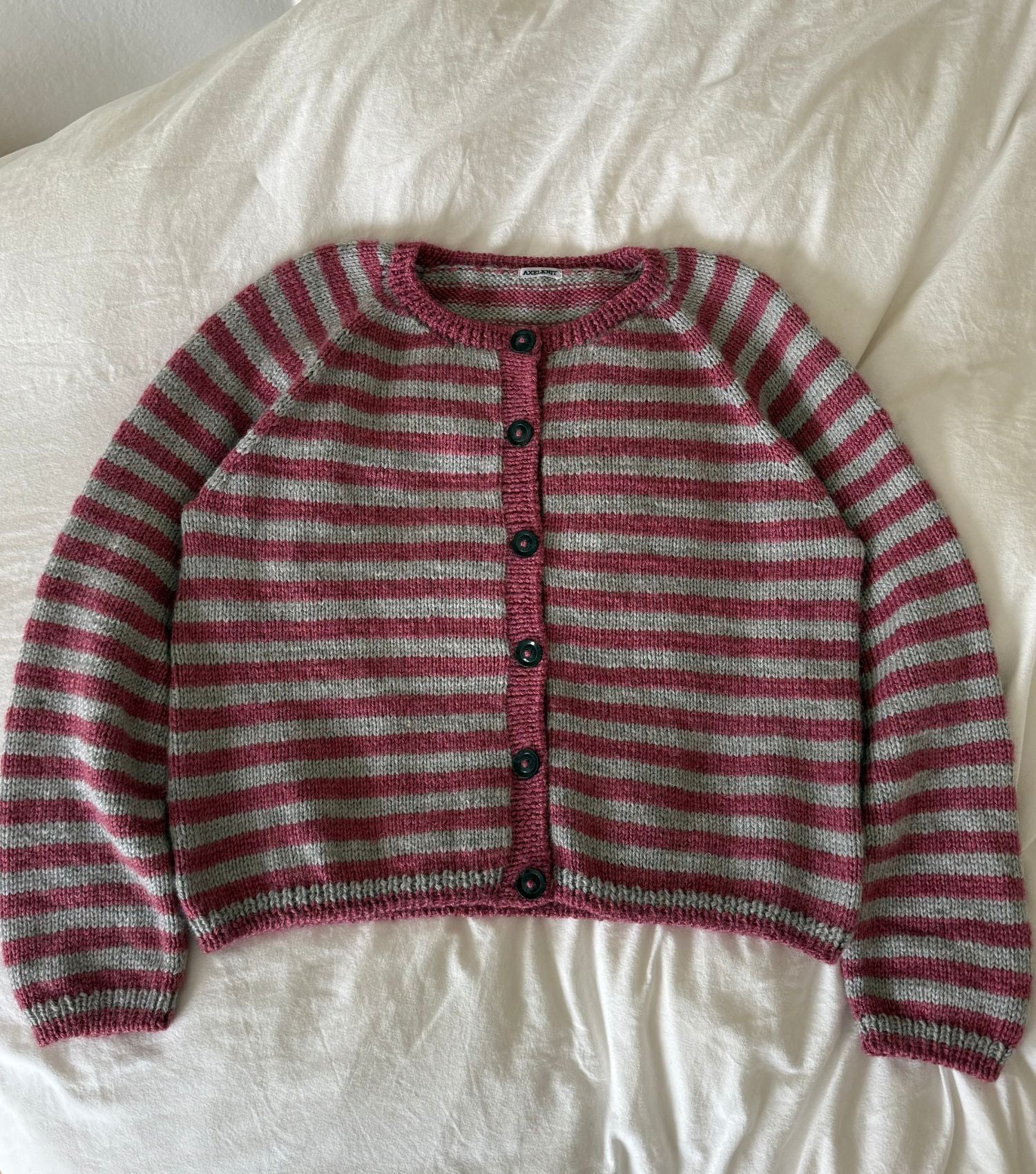 Den grå og lyserøde Ingeborg Jacket er strikket i ANYDAY Merry fra Mayflower, i farven Rosa [32] og Lysegrå [11].